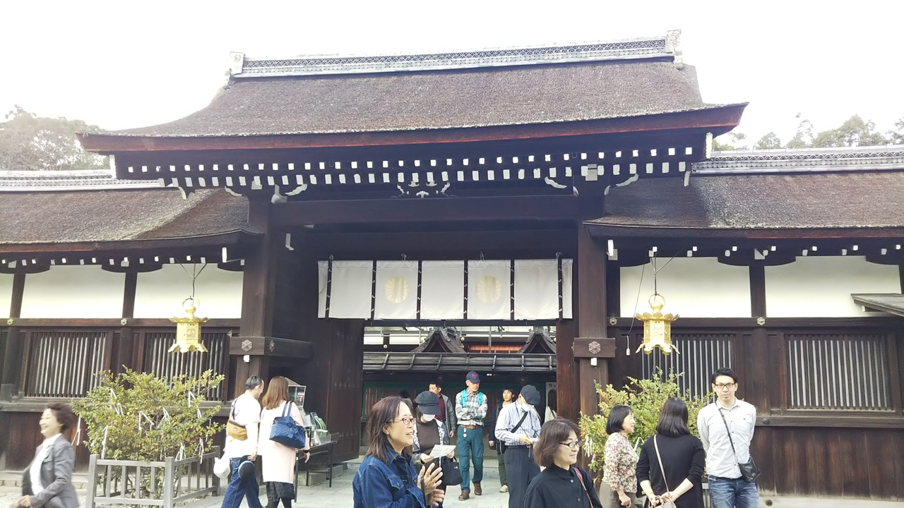 上賀茂神社からバスで移動しました。拝殿は参拝客で賑わっていました。十二支をまつった社があり、自分のえとの社で参りました。参道を歩くと、台風の被害で樹木や鳥居が倒れていました。御朱印は五人ぐらい並んでいました。