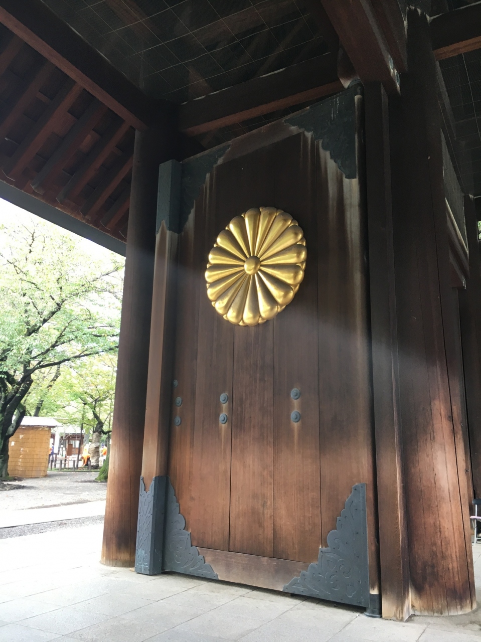 靖国神社の参道を歩き、こちらの神門をくぐって本堂へ向かいました。よく写真などで見る、とても大きく重厚な扉に金色の大きな菊の紋章がありました。参道沿いにいろいろな慰霊碑や献木があり、神門に辿り着くまで時間がかかります。