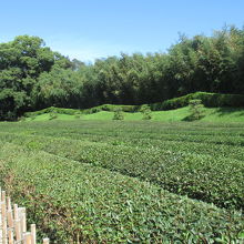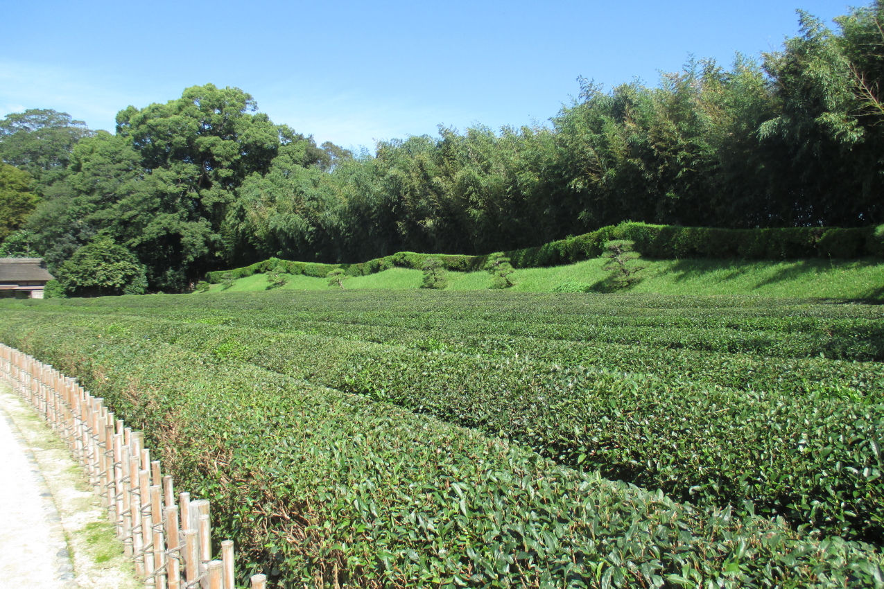 東辺の一画に茶畑がうねっていました。訪れた時は秋口でしたから、庭木のように綺麗に整備され、来年の新芽の芽吹く準備が進められていました。この茶畑は築園当初から作られていたそうで、当時から、お茶が大切に扱われていたものだったことが分ります。