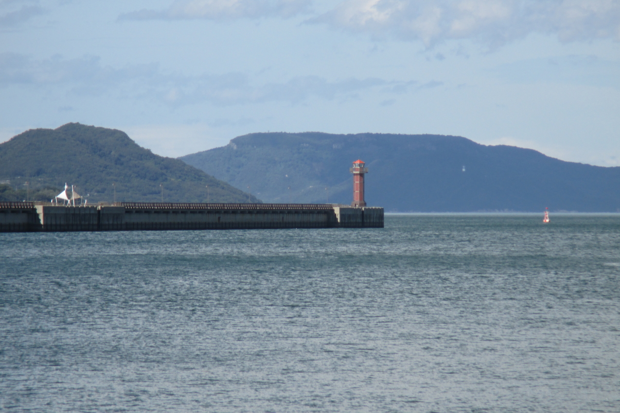 高松サンポートなどを観光したときに、連絡船の発着する岩壁沿いを歩いていると、港のずっと先まで突堤が伸び、先端にはくすんだ赤色の灯台が見えました。波穏やかな瀬戸内海の港でもこんな長い突堤が必要なんだと感心しました。先端の灯台は高松港玉藻防波堤灯台と呼ばれるそうで、全面が赤いガラスで覆われているそうです。見てみたいと思いましたが、先端まで歩いて行く勇気は湧きませんでした。