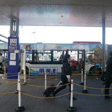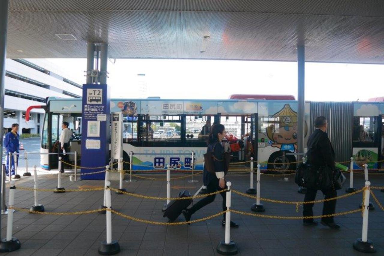 エアロプラザからピーチ航空の第2ターミナルまで無料で送迎してくれます。最近は2両連結の大きな車両です。荷物を置くスペースも大きくとられています。第2ターミナルは国際線と国内線の間ぐらいに到着しますが、国際線の建物には端っこから入ることになるのでチェックイン機までちょっと歩きます。
