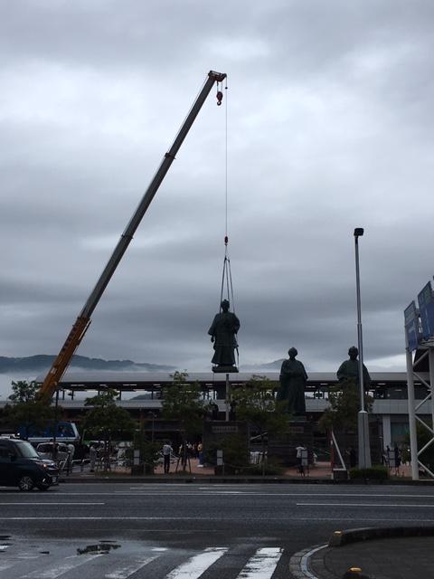 今年、列島を駆け抜けた台風24号ですが、高知駅前ひろばの「土佐三志像」はクレーンで撤去されていました。