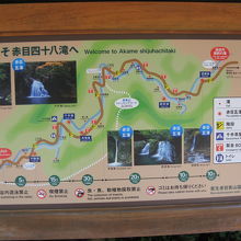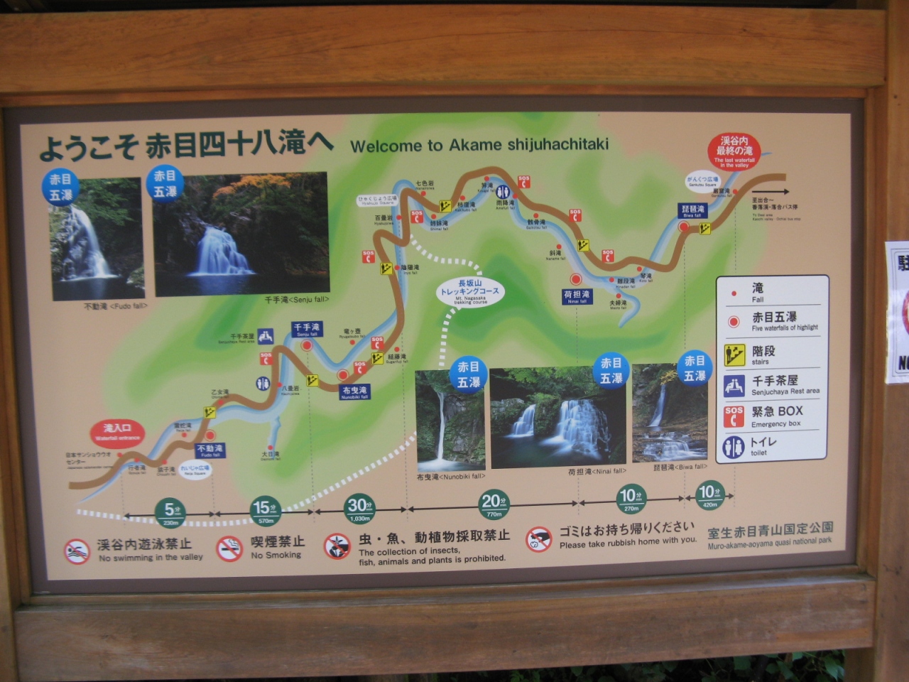 四十八滝の渓谷入り口にオオサンショウウオセンターがあり、そこで入場料金400円を払ってセンターの建物を抜けて歩き始めます。現地にあった案内板によると、渓谷内の最終の滝まで歩くと90分かかると表示されていたので、時間の都合で途中まで歩きましたが、きれいな川と滝に癒されました。紅葉の季節に行けばもっと良かっただろうと思いました。初めは歩きやすい道ですが、階段や急坂など歩きにくい道がありますので、歩きやすい靴が良いです。どこまで歩くかは、添付の案内板の写真を参照ください。