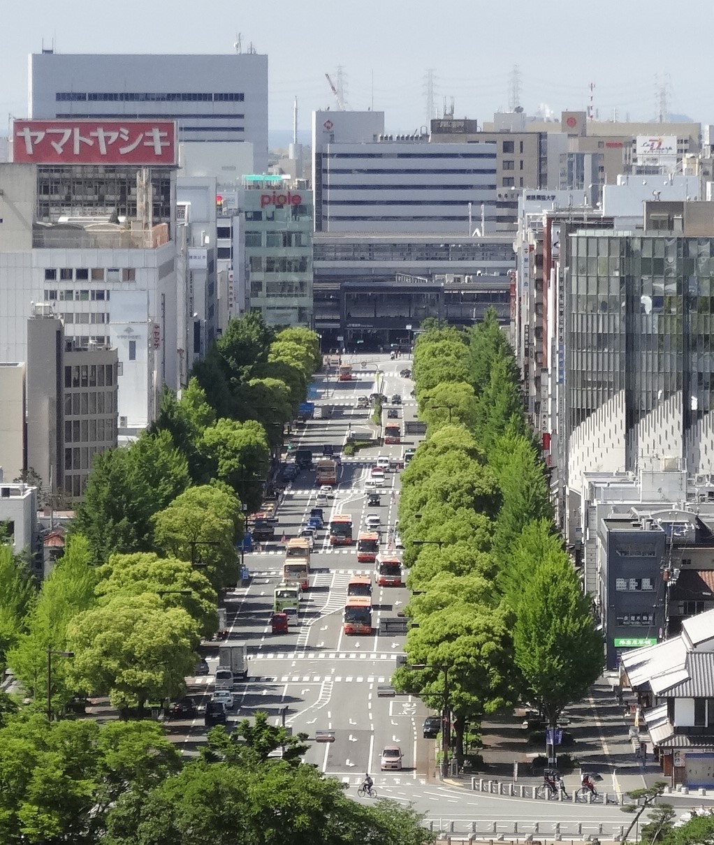 姫路駅から姫路城まで続く姫路のメインとなる通りです。駅から見ても、姫路城内から見てもまっすぐ伸びる広くて見晴らしのいい通りです。周囲には、わきの路地から入れるアーケード商店街があり、駅から姫路城のほうにまっすぐ長く続いています。