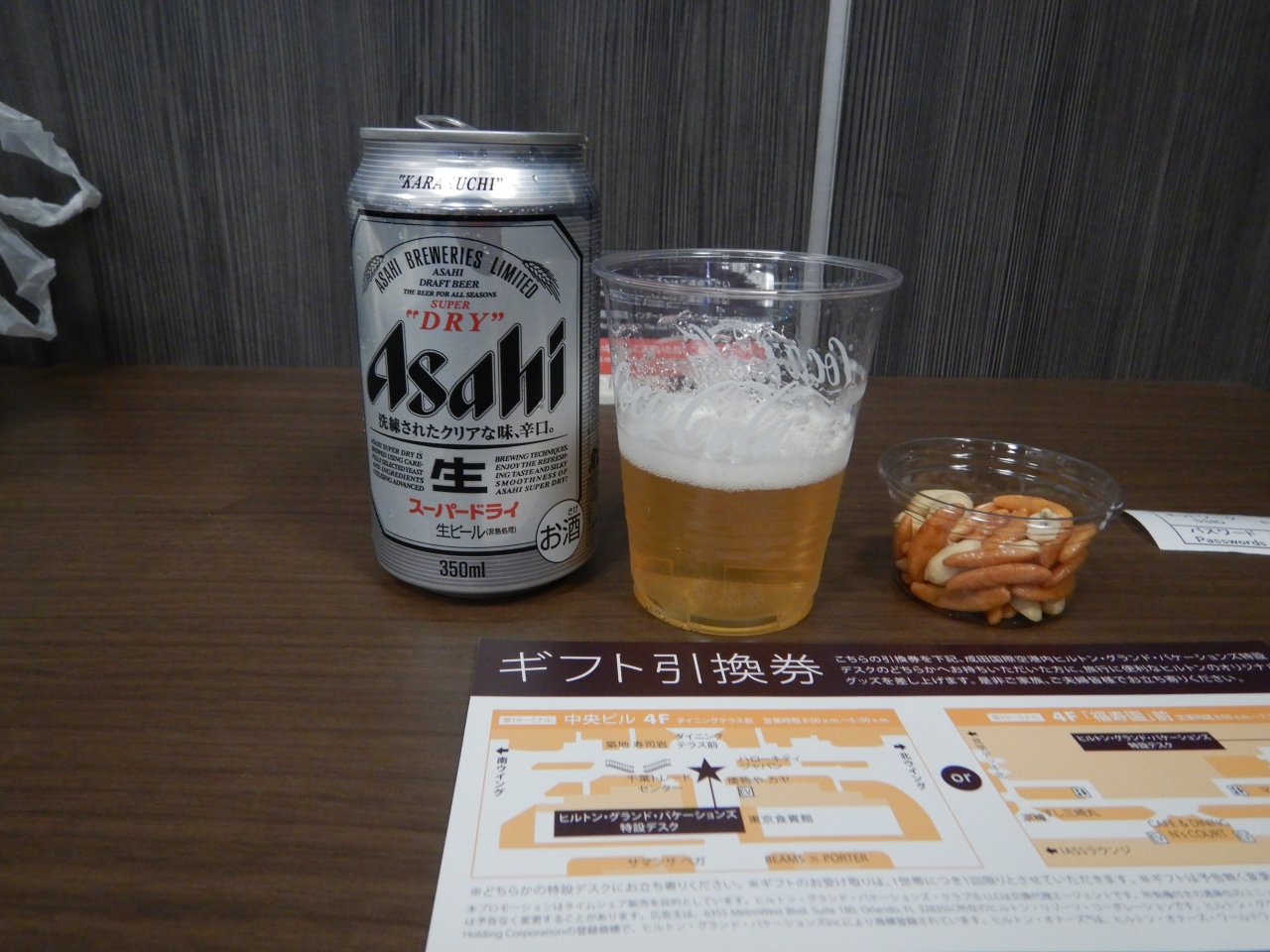 ビール1缶が無料なので、ビールをいただくことにした。Wi-Fiが使利用できる。新聞等もあるので、搭乗前に時間潰しができた。