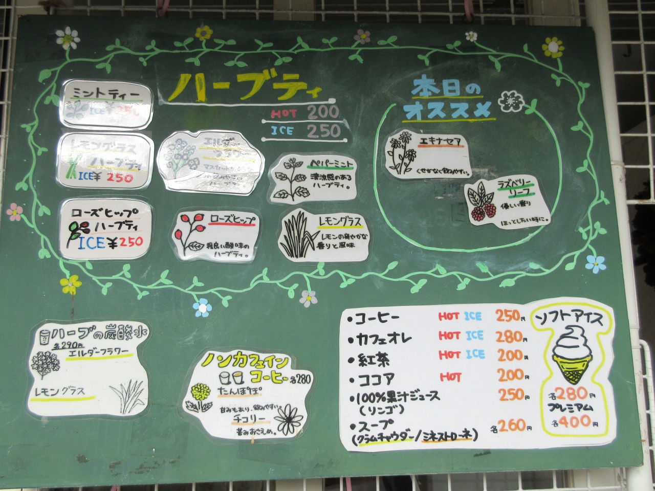 水鳥の池そばにあるハーブ園にあるカフェです。昭和記念公園立川口から15分ほどで着きます。軽食のナン付きカレーやボーンフランクやドリンクなどがあります。ハーブティーが色々ありメニューに簡単な説明が書かれていました。土産物用のハーブティーやバラジャムを売っているのも花木カフェの特徴です。花を眺めながらテラス席でハーブティーを飲みながらくつろぐのもいいでしょう。ソフトクリームやスナック菓子もあり子連れが気軽に利用できるカフェでした。みんなの原っぱにある売店との違いはこじんまりとして落ち着いた雰囲気だと思います。