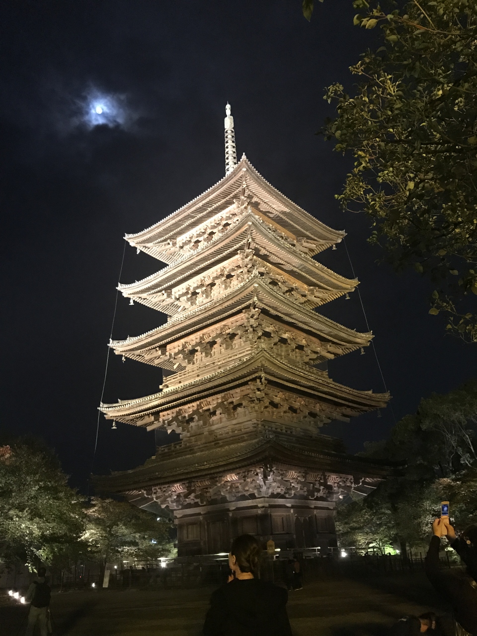 11月初めに訪問。木々が色づき始めた頃で、完全な紅葉を見ることはできませんでしたが、緑から赤のグラデーションの紅葉を楽しむことができました。最も、夜間開館日の訪問なので、ライトアップされた五十の塔や金堂の見学がメインになってしまいました。朧月夜とライトアップされた五十の塔が美しかったです。夜間でも金堂の中を開放していました。