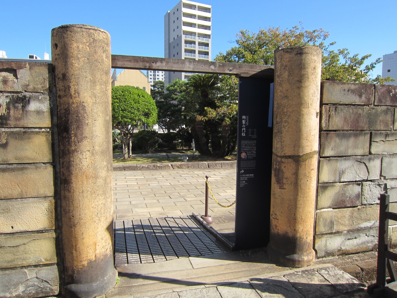 出島には、復元された建物だけでなく、当時のままの貴重な物も見ることができます。西側ゲートからまっすぐ進むと左側のブロック塀に、どっしりと下門柱がありました。オランダの会社の製品で当時出島にあった店舗に使用されていた門柱です。
