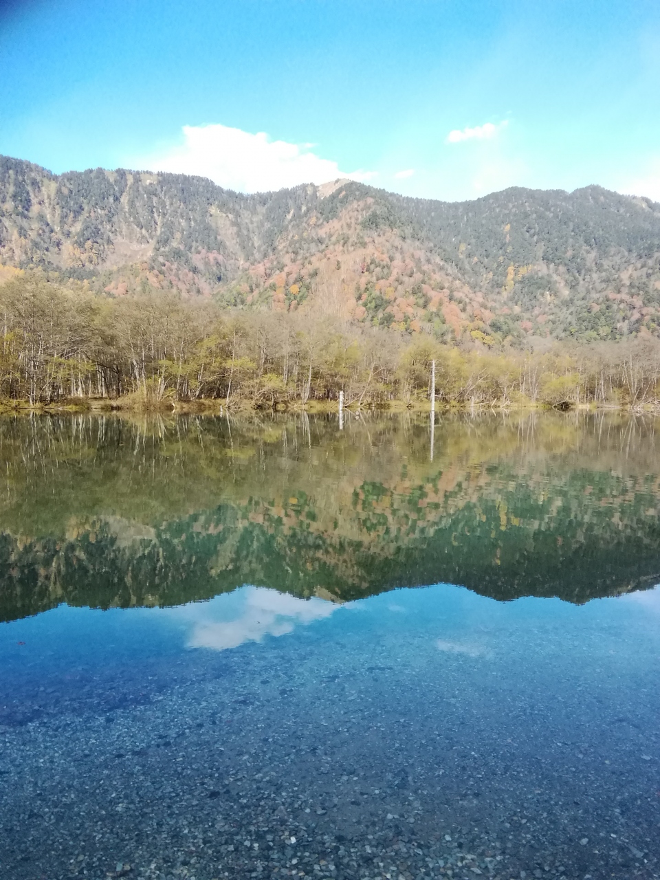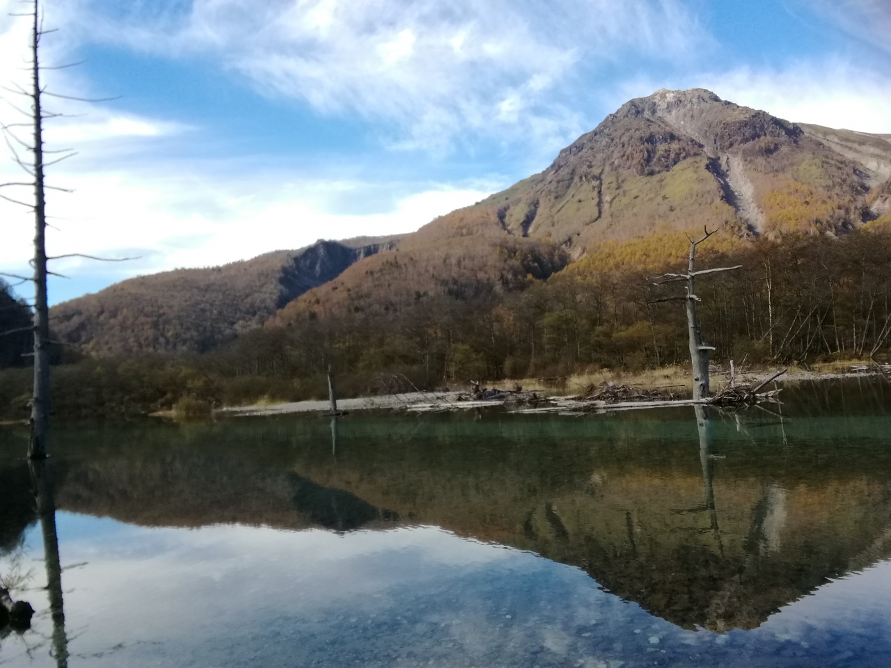 紅葉を見に上高地に来ました。まずは大正池で下車し、上流の河童橋,明神池を目指して歩き始めました。この日は、快晴で無風の状態でしたので水面は鏡のように木々の紅葉と焼岳を映し出していました。年々土砂でその大きさが小さくなっているというが、周りの紅葉と水没した林の幻想的な立ち枯れは、神秘の景観を見せていた。