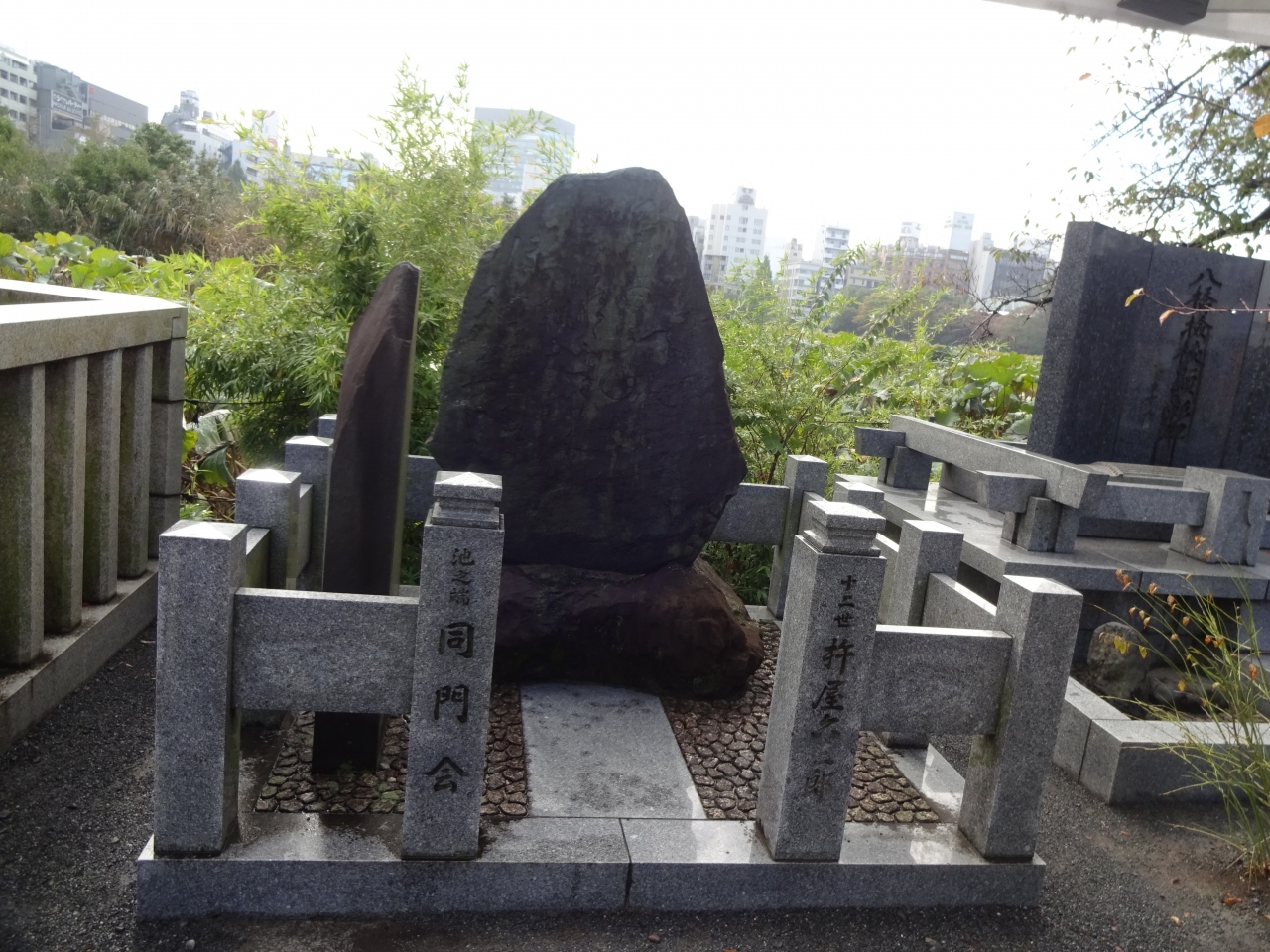 碑の文字は読みにくいが、この碑を囲む柵の一部の石に「杵屋六三郎」なども文字が見えたので長唄関係の物と判断。