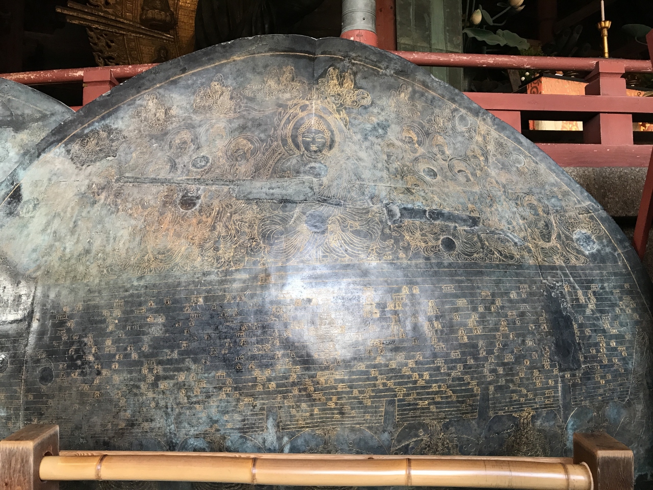 入口を入ると、大きな大仏様が目の前に鎮座しています。金堂の中を自由に写真を撮れるのは嬉しいです。金堂の中に入って、注目したのが、蓮華像世界図という岩。古代の楽譜かと思ったら、華厳経の教えを複雑な絵で表したものなんだそう。この岩から、右回りに金堂の中を回れるようになっていて、仏像をいろんな角度から見ることができます。