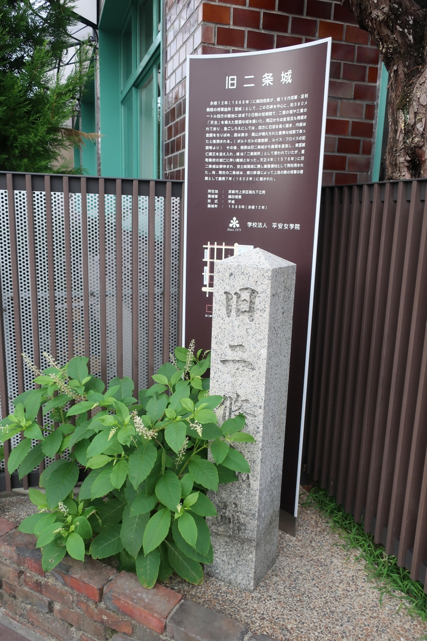 現二条城の北東焼き1㎞の京都御所の近くにある平安女学院の一角に旧二条城跡の碑が建てられています。現二条城は徳川家が創建したものなのに対し、旧二条城は織田信長が築城したもので別物です。平安女学院の敷地が正に旧二条城のあった場所に位置します。行ってみて疑問に思ったのは二条にないのに何で二条城?なのか。