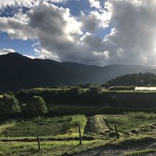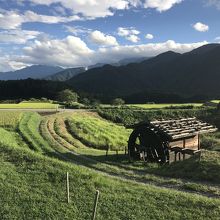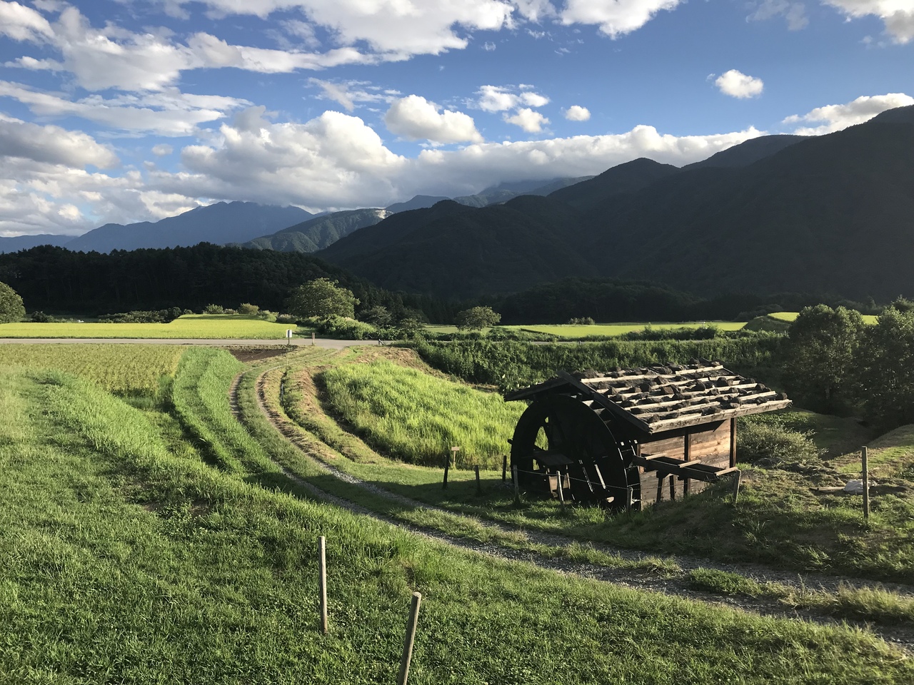 甲斐駒ケ岳・鳳凰山・富士山を望み、陽当たりの良い場所に復元された竪穴式住居と田んぼや畑と水車小屋の長閑な風景には、心を落ち着かされる。