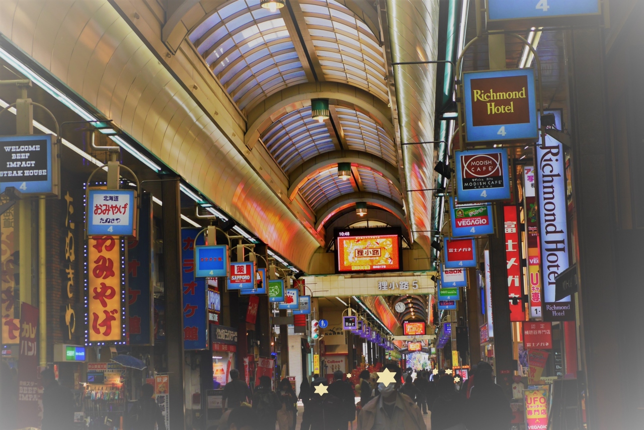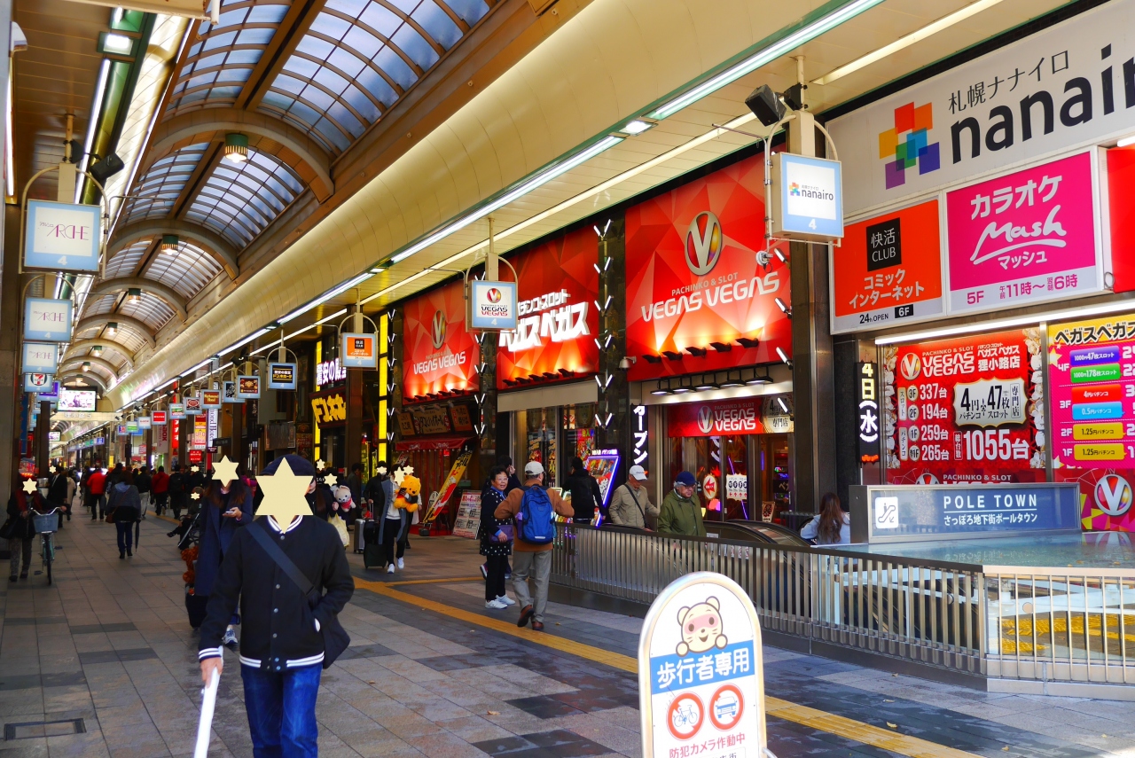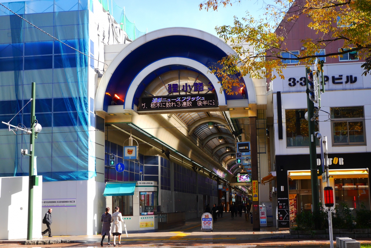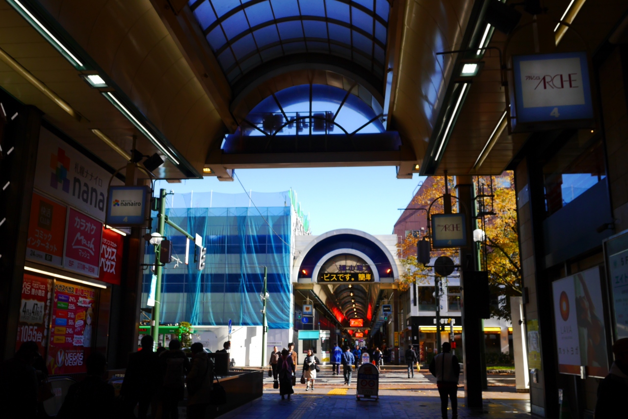 札幌で最も旧い商店街として知られる狸小路商店街はススキノと大通り公園の間にあるアーケード商店街です。歩行者専用の歩道の両側に数多くの店が並び、地方都市で見かけるシャッター街ではなく、活気あふれる街になっています。道路には所々ベンチも置かれ、小休止もできます。