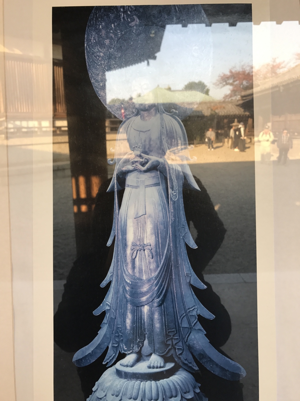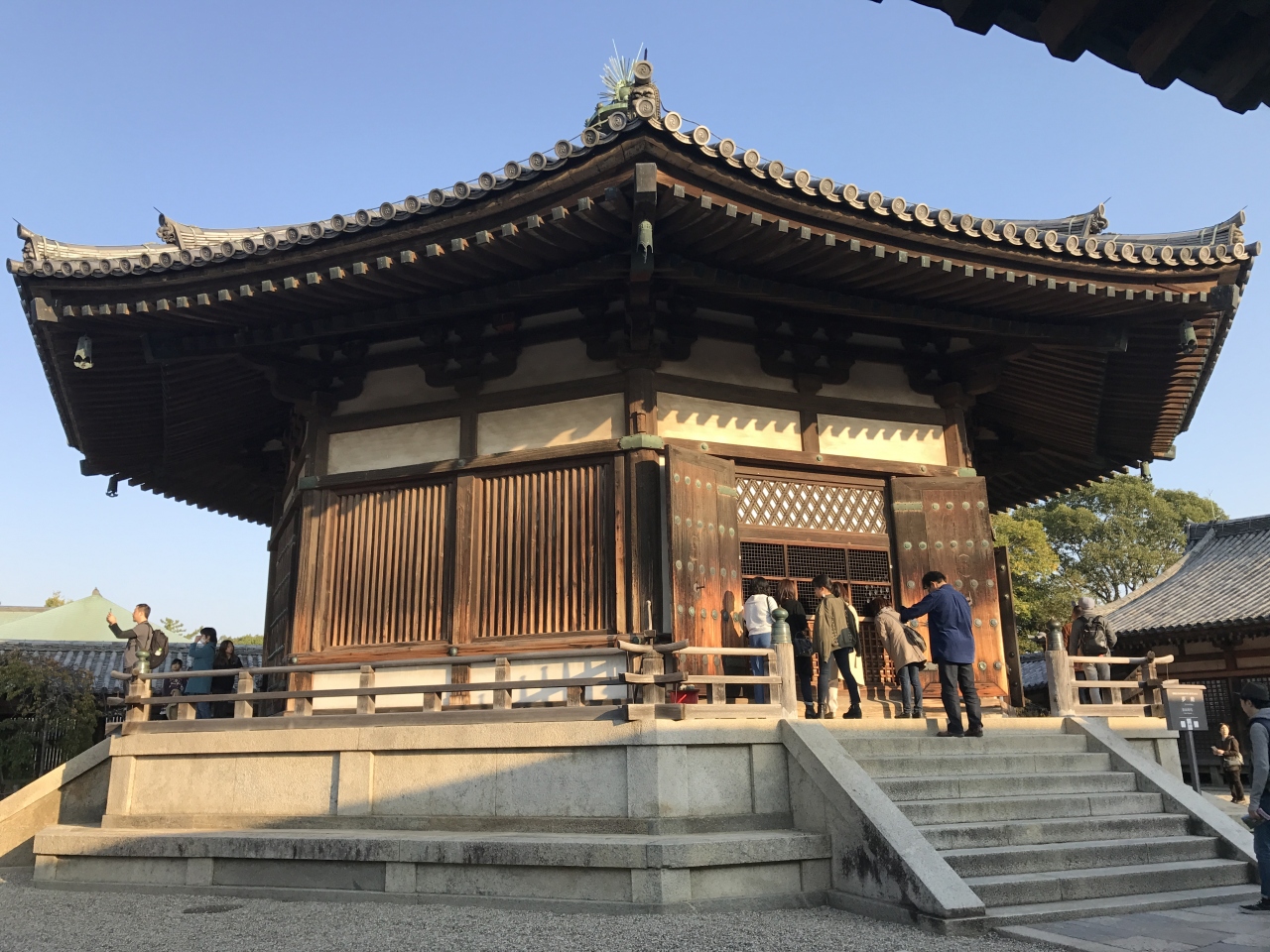 前回見られなかった、救世観音像の特別拝観を見に来ました。今回のメインです。夢殿の中は救世観音を囲むようにお詣りスペースになっていました。特別な日に住職がお経をあげるのでしょうか?救世観音は金堂の釈迦像と百済観音にそっくりでした。面長が特徴で、飛鳥時代の仏像の特徴なんだそう。