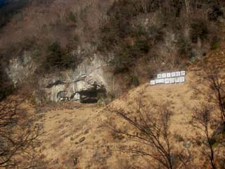 三峰口駅から三峯神社行きのバスに乗って荒川を遡ると、途中の大輪には鳥居があり三峰ロープウェイが三峰山まで結んでいました。さらに進むと対岸に洞窟が見えて、天然の洞窟で縄文時代の遺跡がある神庭洞窟遺跡でした。