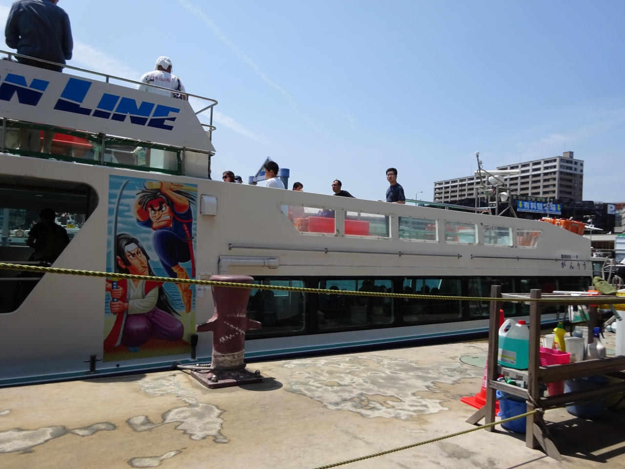 唐戸、門司港、源流島を結んでいるフェリーです。1回の乗車は400円ですが、1日乗船券は900円なので、唐戸と門司港を往復するのに100円プラスすれば源流島にも行けると思い、1日乗船券を購入しました。(小学生は450円でした)