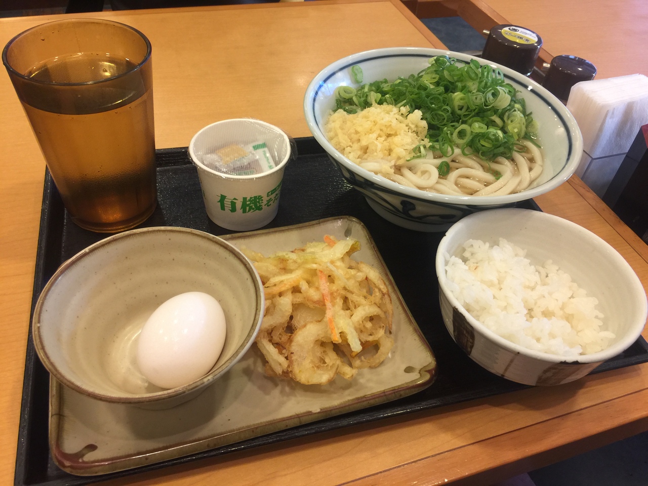食べたのは納豆朝食うどん大盛450円!かけうどん、かき揚げ天、ご飯、生卵、納豆です。朝にぴったりでイイですよ(^ ^)