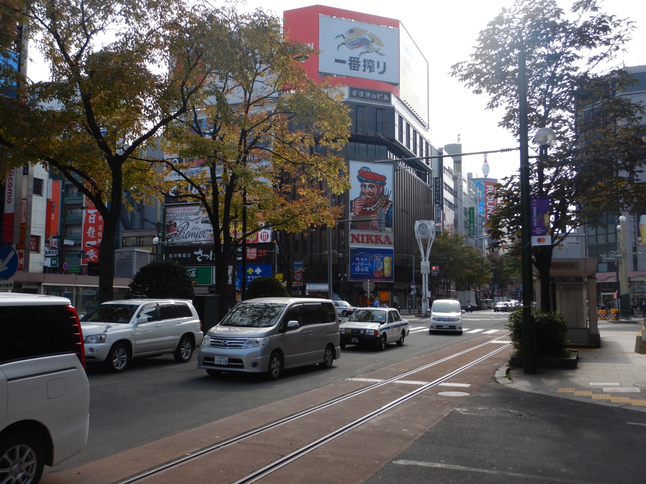 写真は午前中のものだけど、9月の地震の影響もなくなり、夜のネオンは正常に戻っていた。このニッカの看板を見るとすすきのに来たことを実感する。市電の走行を見たりしながら、遅めの朝食をどこで食べようか考えながら歩いてみた。