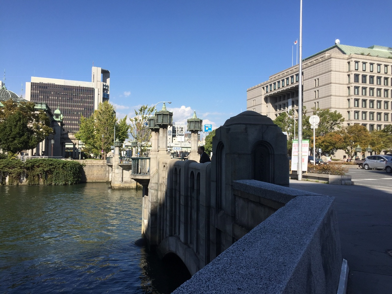 地名として有名ですが実際の橋も健在です!戦前にかけられた淀屋橋は大江橋と同様に国の重要文化財。趣のあるコンクリートアーチ橋です。東京の日本橋と同じく、歴史の交差した場所。京阪がココを目指したことがわかる古い町並みが旅情、いやビジネスマン心をくすぐります。