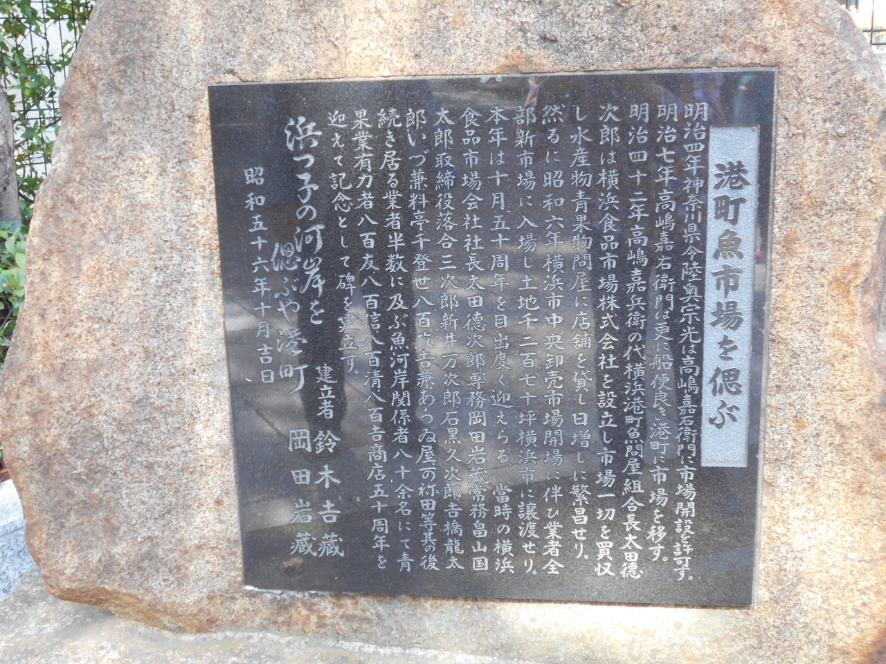 JR関内駅南口改札を出てすぐ、横浜市役所の脇にこちらの石碑は置かれています。昔ながらの言葉で書かれており、なかなか読み辛かったです。明治時代にこのあたりに魚市場が開かれ、大変繁盛していたということが書かれていました。多くの人が通る道沿いですが、ほとんどの人は石碑に見向きもしていませんでした。もっと書かれている文が読みやすかったらよかったんですけどね。
