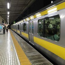 黄色い電車こと総武線。中央線と並走しているエリアでは各駅停車として運行されています。オレンジ色の中央線よりも空いていることが多いので、座りたいひとは総武線をすすめます。他にも千葉県内を走る本来の総武線もありますが、そちらは千葉駅から東側は本数はかなり少なめです。