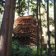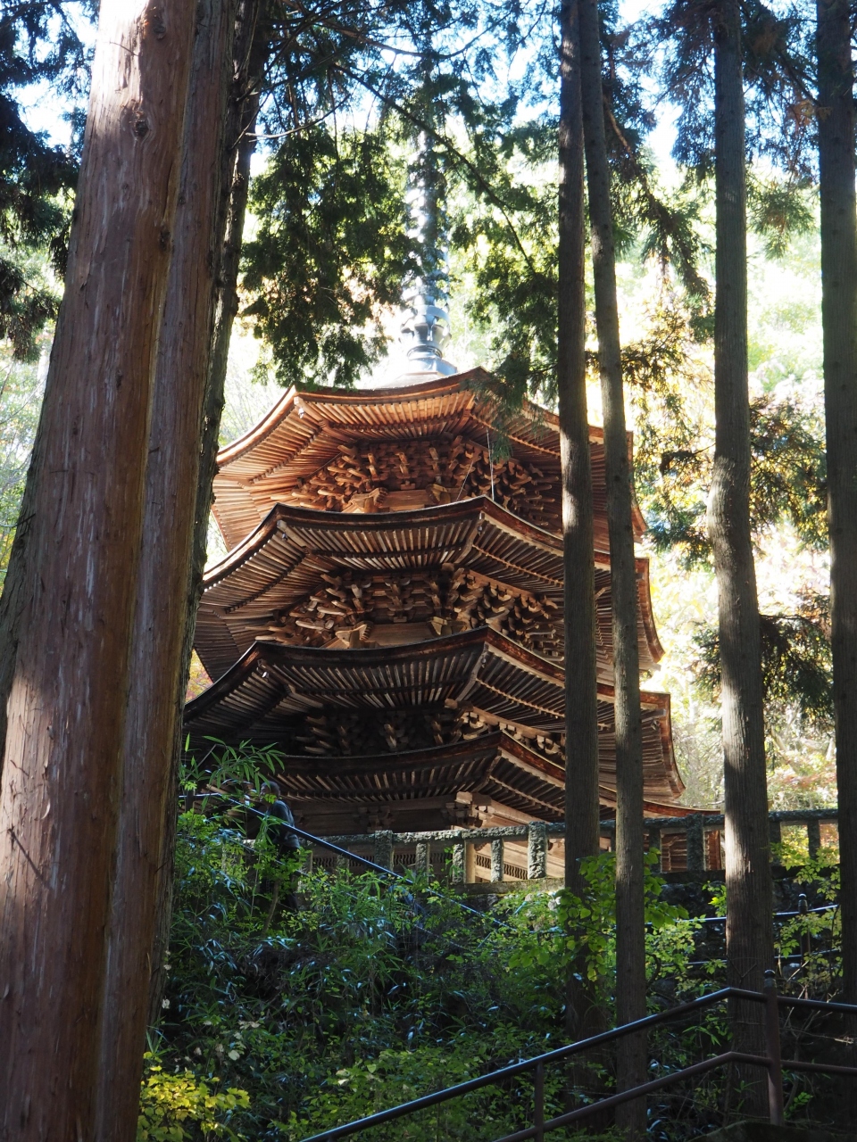 本堂の左手に国宝「八角三重塔」への入り口があります。ここで拝観料300円を支払い、経堂などにお詣りしながら、石段を登っていくと八角三重塔があります。林に囲まれた墓地の間に立つこの塔、じっくり眺められます。よくもこんな塔を考えて、この地に建てたものだと感謝しかありません。鎌倉時代から今まで建っている歴史の重みも感じました。別所温泉に行って、この塔も見ずに帰るのはもったいない。