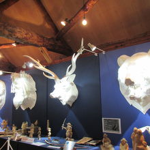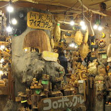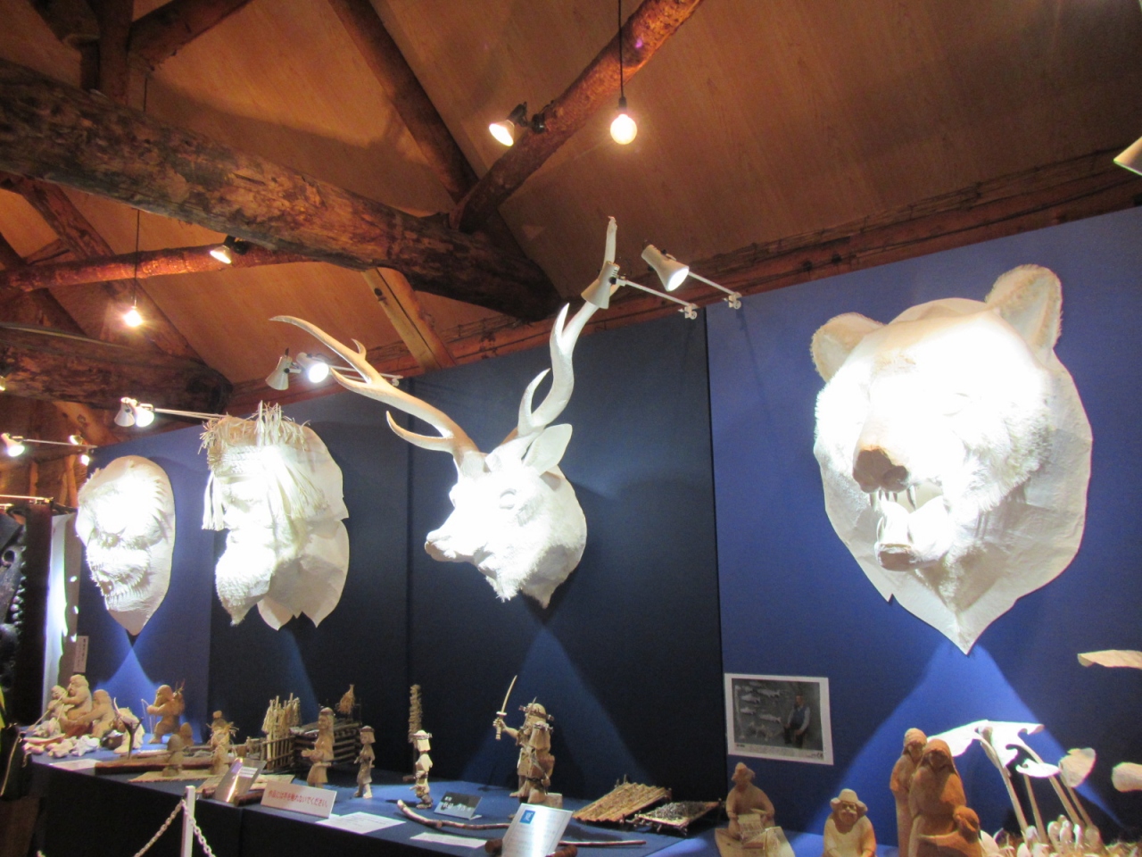 神社の本殿のようなアイヌの祭殿(アイヌ文化伝承館チセ)があり、その前には門前のお店のように、木彫り人形やアクセサリー、インテリアなどの民芸のお店が並んでいます。