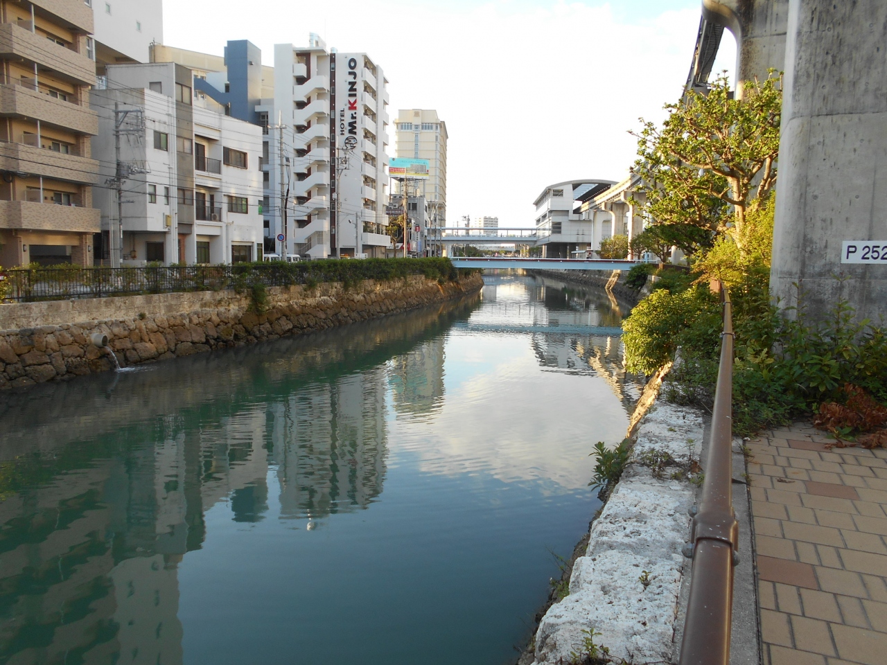 久茂地川は那覇市内を流れる川で、ゆいレールが久茂地川に沿うようなルートで走っています。都市部にあることからお世辞にも綺麗な川とは言えず、緑色に濁っていました。那覇市内を分断してしまう久茂地川ですが、思った以上に橋は多く、川を越えて移動するのにあまり困るようなことはありませんでした。護岸工事がしっかりとされており、あまり景観がいい川ではありませんね。