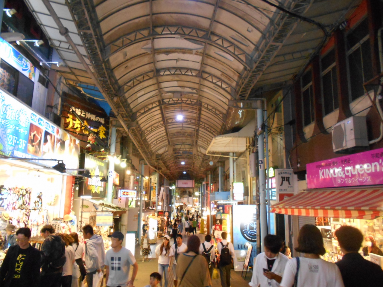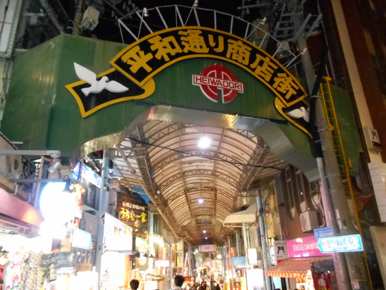 平和通りは桜坂中通りの西にある通りで、桜坂中通りとは希望ヶ丘公園を挟んで反対側になります。アーケード付きの商店街になっており、悪天候の日でも楽に買い物ができそうな商店街でした。金曜日の夜20時頃の訪問でしたが、まだ開いているお店が多く、多くの人が行き来していて活気がありました。飲食店、雑貨屋など様々なお店があって、歩いてて楽しい商店街でした。