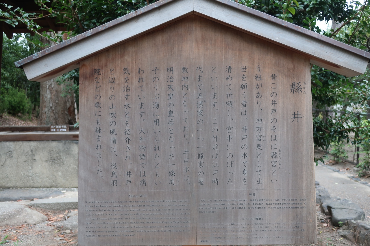 京都御苑の中宮内庁京都事務所の西側に縣井があります。京都三名水の一つに数えられ、和歌にも詠まれた名水の井戸でしたが、現在は枯れてしまっており、その名残りが残っているだけです。