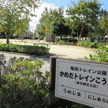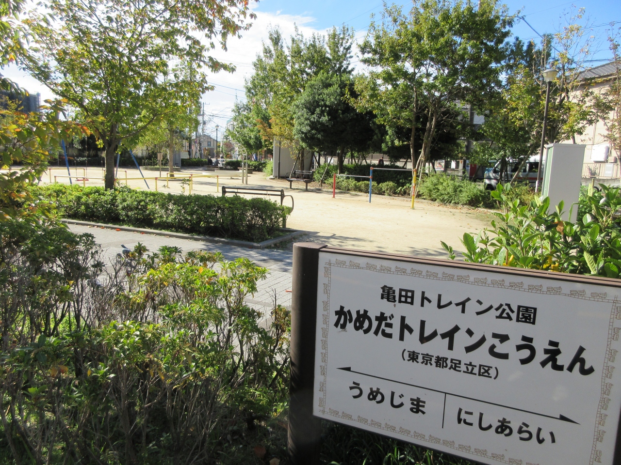 東武伊勢崎線・西新井駅西口から梅島方向に線路わきを5分ほど行ったマンションの向かいにある公園です。ブランコと鉄棒、健康器具が設置されている普通の公園です。特徴としてはトイレの外壁に、昭和35年から39年にかけての西新井駅の様子や走っていた列車の写真が掲示されていること、トイレの横に東武鉄道の列車に使用されていた車輪が飾れていていることです。公園の名前の由緒も、この車輪にあるのかもしれません。近くに住む人たちが、少しの時間過ごすのに適した公園だと思います。