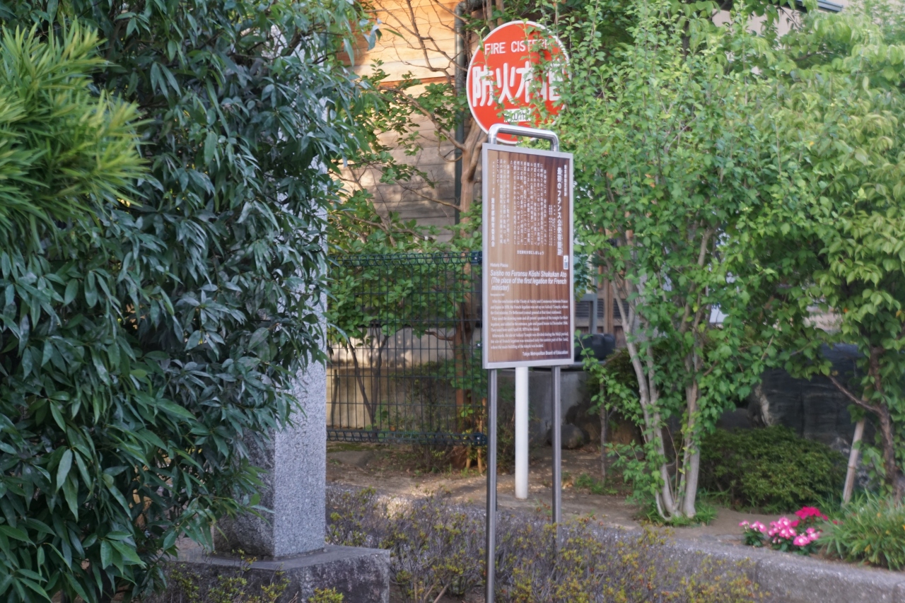 入ってすぐのところに説明板が建っています。ここは初代フランス駐日総領事ベルクールが宿舎にした場所。ただ、時代は尊王攘夷の風が吹き荒れて外国人にとっては身が危険だった時代。坂の上で周囲はそれなりに見通せる場所ですから、日本側の警護のしやすさも考慮されてのことだったと思います。