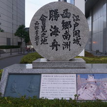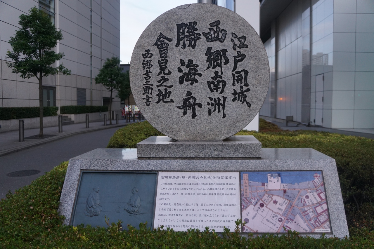 西郷 勝会見は、現在の三菱自動車本社、旧薩摩藩蔵屋敷で行われました。まあるい石碑には、「西郷南洲」「勝海舟」と並んで名前が刻まれています。
