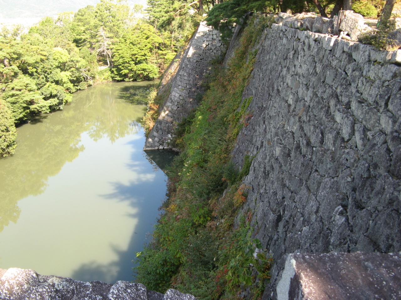 藤堂高虎の築城の特徴といえば、高石垣が有名ですが、ここ上野城本丸の西に築かれた石垣の高さは30メートルあり、“日本1、2の高さ”と表示があり、石垣の上からの堀を覗くとなかなか迫力がありました。