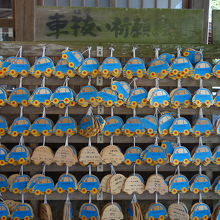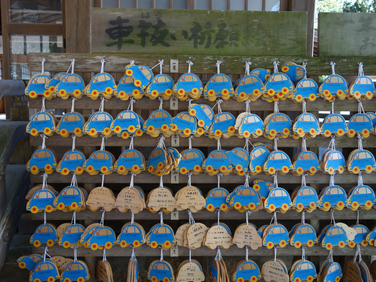 クルマ安全祈願のお札がたくさん下がっていました。由緒は難しい。