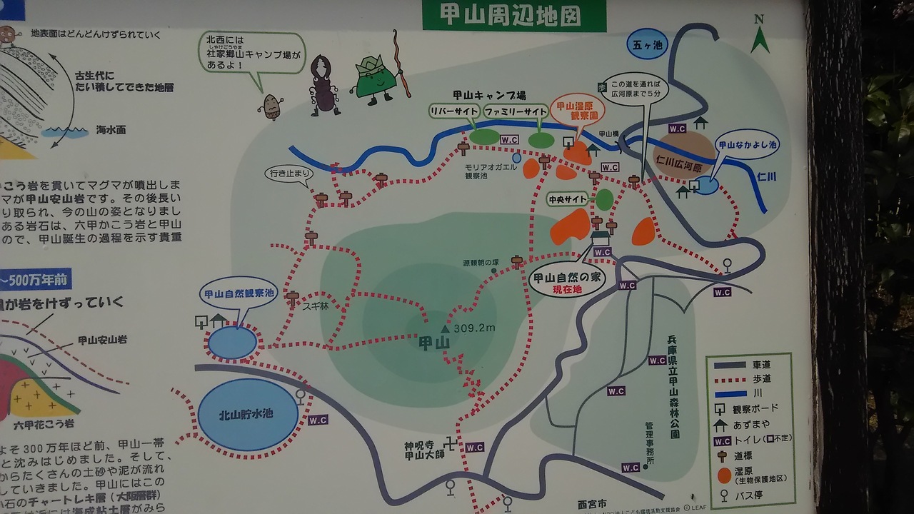 三月に訪れたのですが、春は木や植物が生き生きとしていて、歩くのが楽しかったです。自然の家の前にある甲山自然学習館は、甲山の生き物や自然の資料や展示があり、広くはないのですが興味深くておもしろかったです。