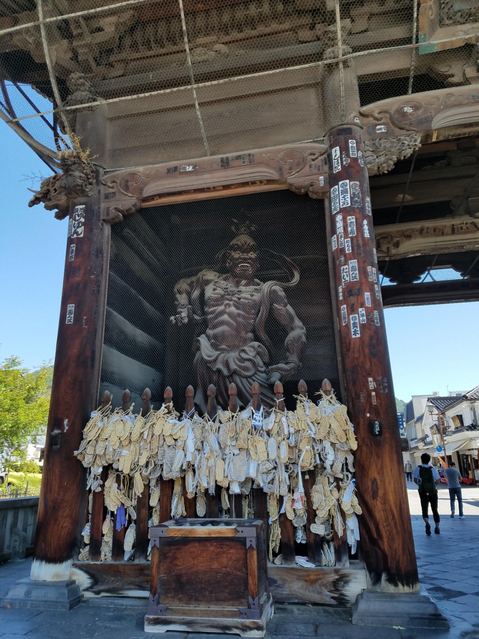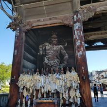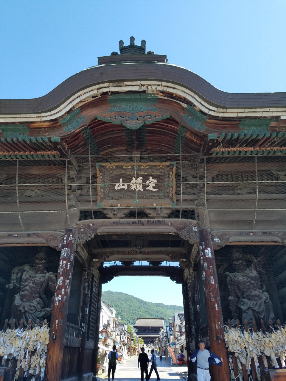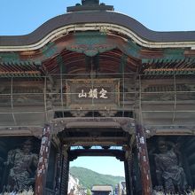 仁王門は、宿坊が並ぶ石畳の参道を本堂に向かって進んで最初にあります。正面に善光寺の山号「定額山」の額がかけられています。度重なる火災で焼失し現在の問は大正時代に再建されたものですが、重厚感たっぷりで両脇の仁王像の顔つきはたいへん迫力がありました。