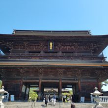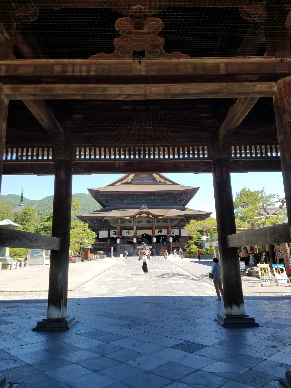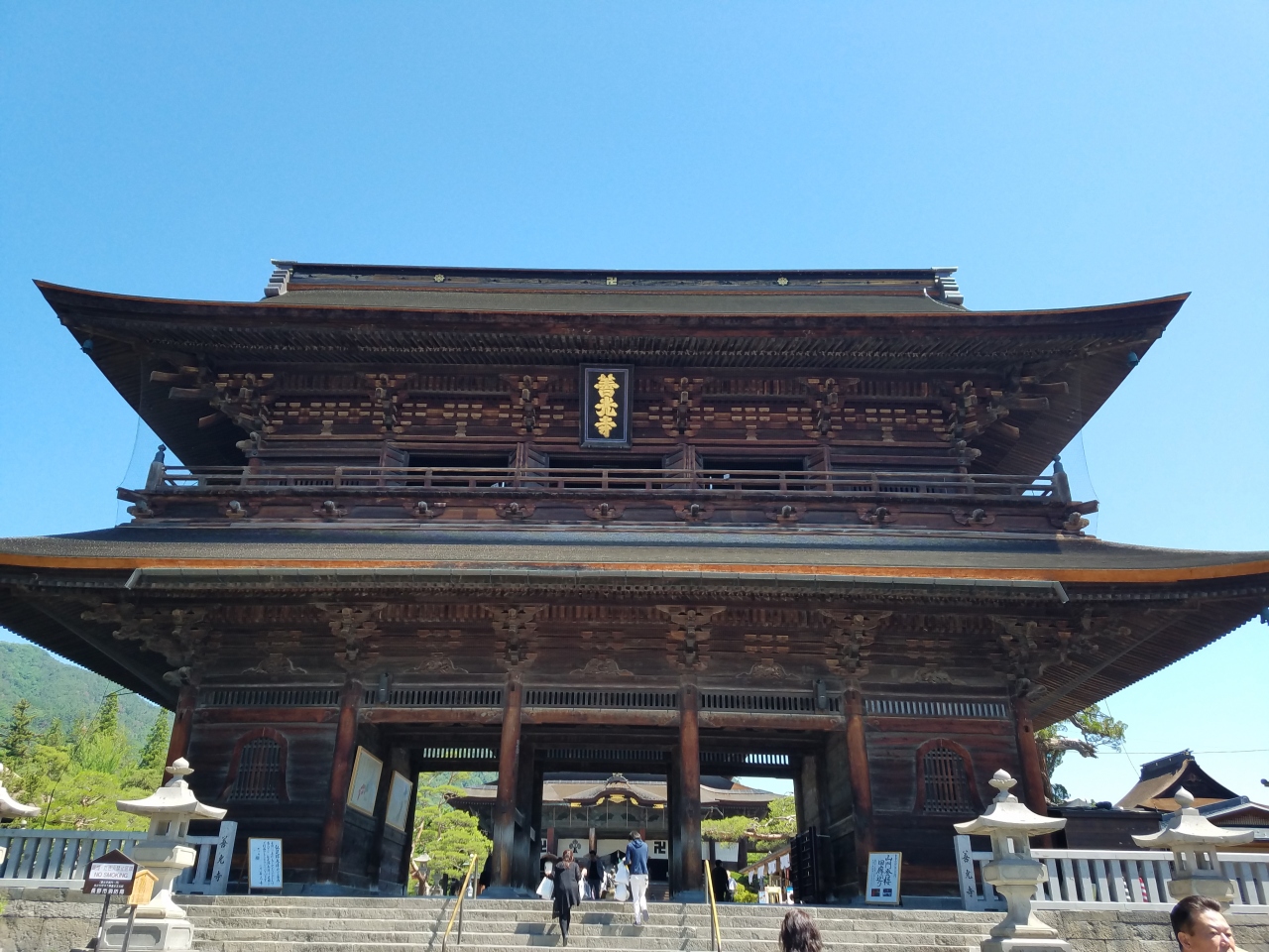 山門は、善光寺参道から本堂に向かい仲見世商店街を抜けたところにある大きな門です。二重の萱屋根が特徴で重厚感あるつくりで国の重要文化財に指定されています。2階部分は有料で入ることができ、眺望を楽しめます。門越しに本堂をカメラを向けると門が丁度フレームのように収まりました。