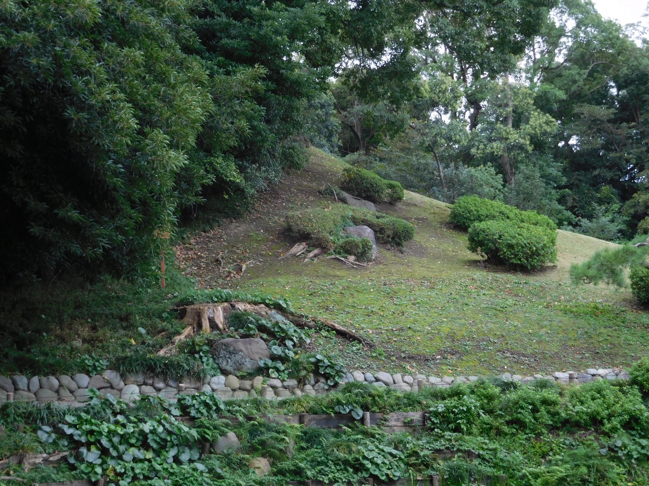 清澄庭園内、大泉水沿いに左回りで歩いて行った先にある、小高い丘(築山)です。近くに行ってもあまり実感が沸かず、木々の生い茂った丘のような印象しかありませんでした。対岸に戻った時に眺めてみると、確かに高くなっている場所があるなとは思いました。