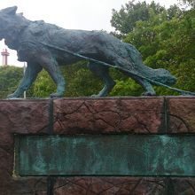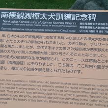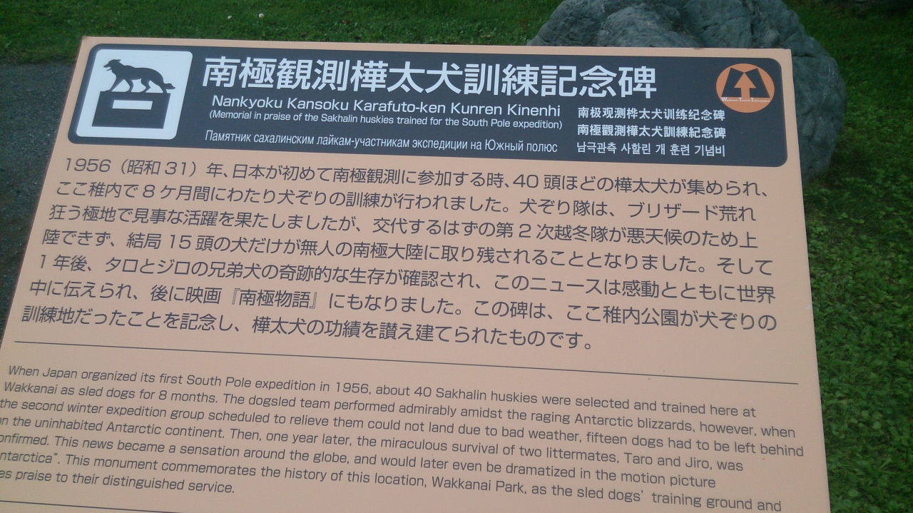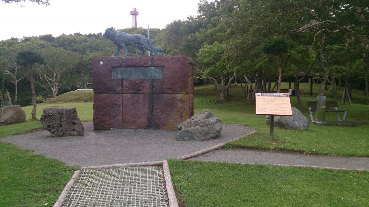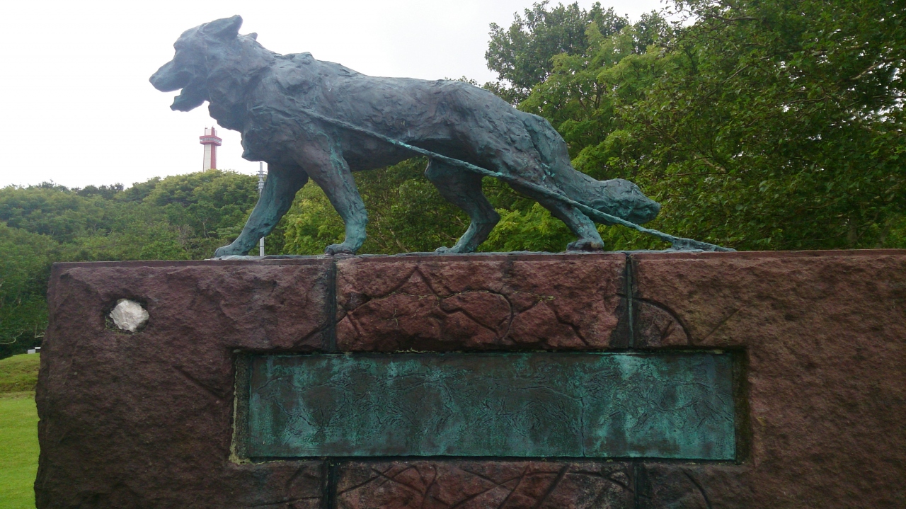 高倉健さん主演の映画、「南極物語」でタロとジロら南極観測でそりを引いた犬たちの記念碑です。この場所で訓練したことが縁で、ここに記念碑と供養塔が作られました。映画にもなったように、悪天候の中、22頭の樺太犬が南極に置き去りにされました。しかし、翌年、観測隊が訪れるとタロとジロが生きていたという物語です。この記念碑は、映画の中でも紹介されています。日本の南極観測の発展に力強く協力してくれた樺太犬たちに感謝と敬意を表して、この像を見ました。