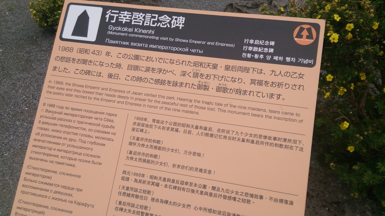 稚内公園の氷雪の門の隣にあります。稚内市内をのぞむ場所に建てられました。1968年に、天皇皇后両陛下が来られた際、樺太の真岡郵便局で自決した九人の乙女の話をお聞きして話されたお言葉を碑に刻んだということです。ここは、氷雪の門、九人の乙女の碑と平和を誓う場所です。両陛下の思いとともに平和の誓いを新たにしました。