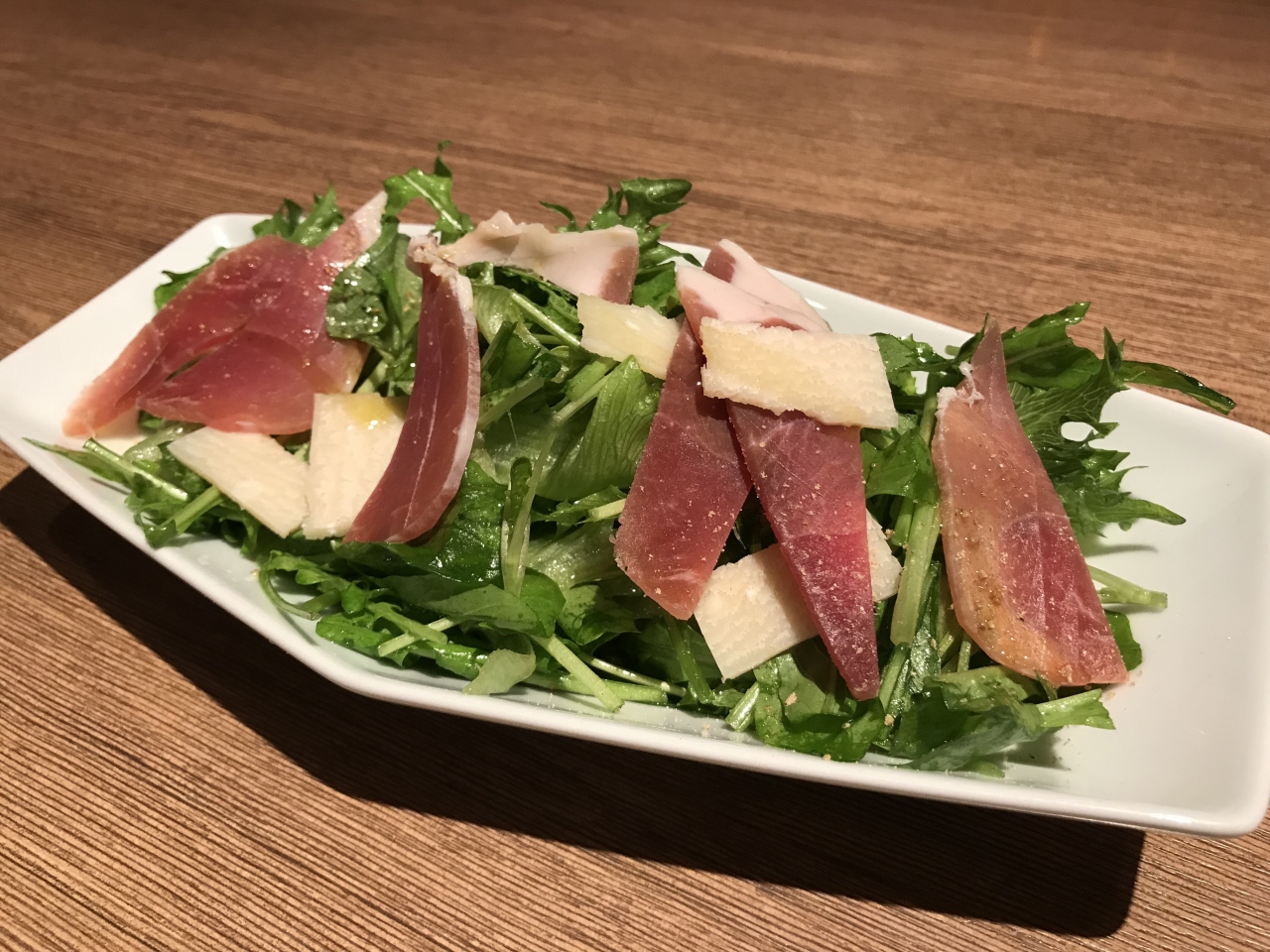 「ルッコラ生ハムパルミジャーノ」サラダはシンプルだけど美味しい。