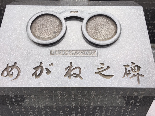 東京の眼鏡業界の組合により昭和43年(1968)に建立され、業界の発展に寄与した先覚者や建立者の名が刻まれています。碑には、「徳川家康愛用のめがね」が描かれています。