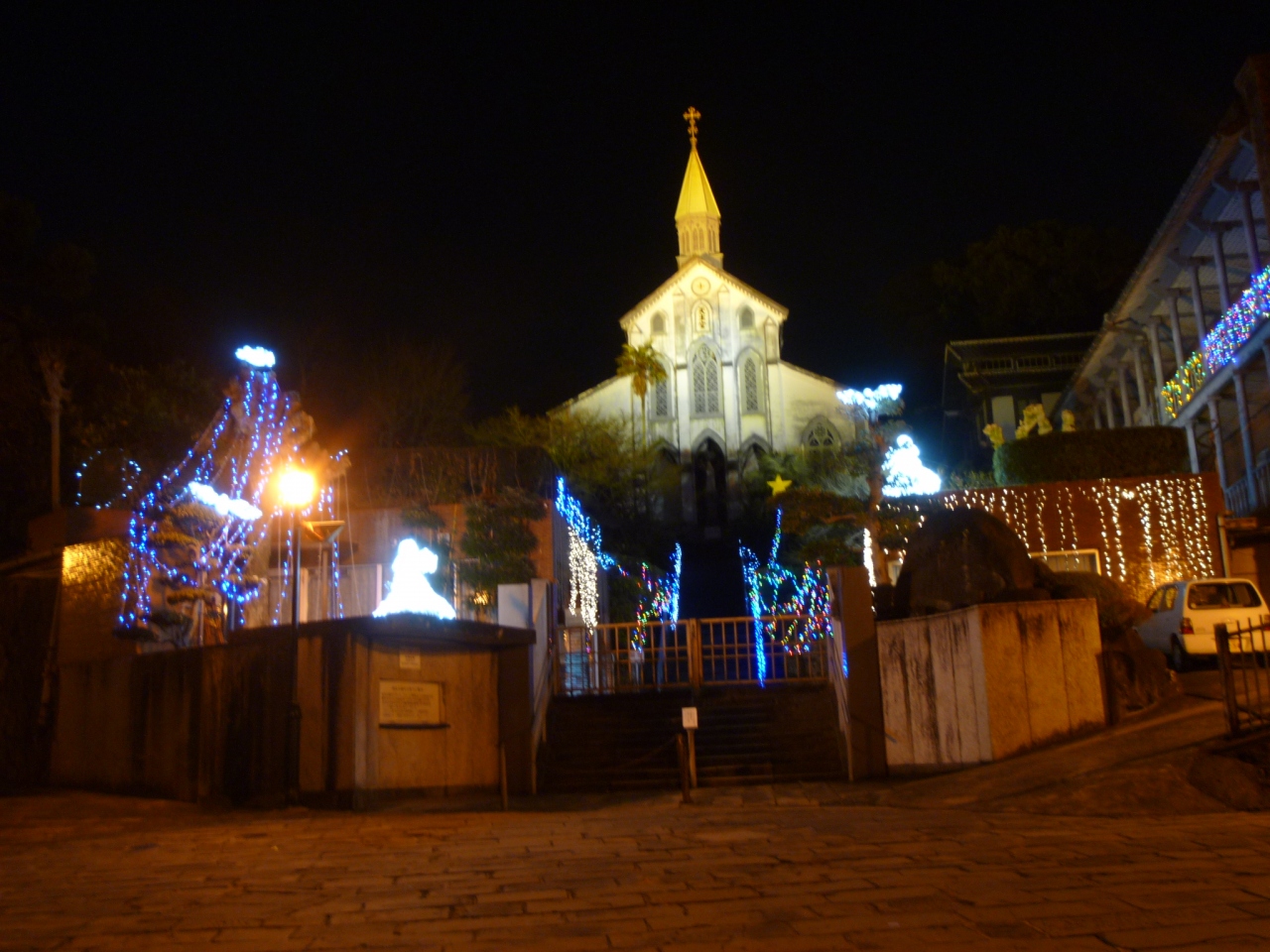 ツアーの自由時間での散策で行きました。12月、長崎といえど寒い。でもその寒さでライトアップした大浦天主堂が映えます。そして、イルミネーションもとてもきれいでした。西洋の建築方式のカトリック教会で、国宝にも指定されています。