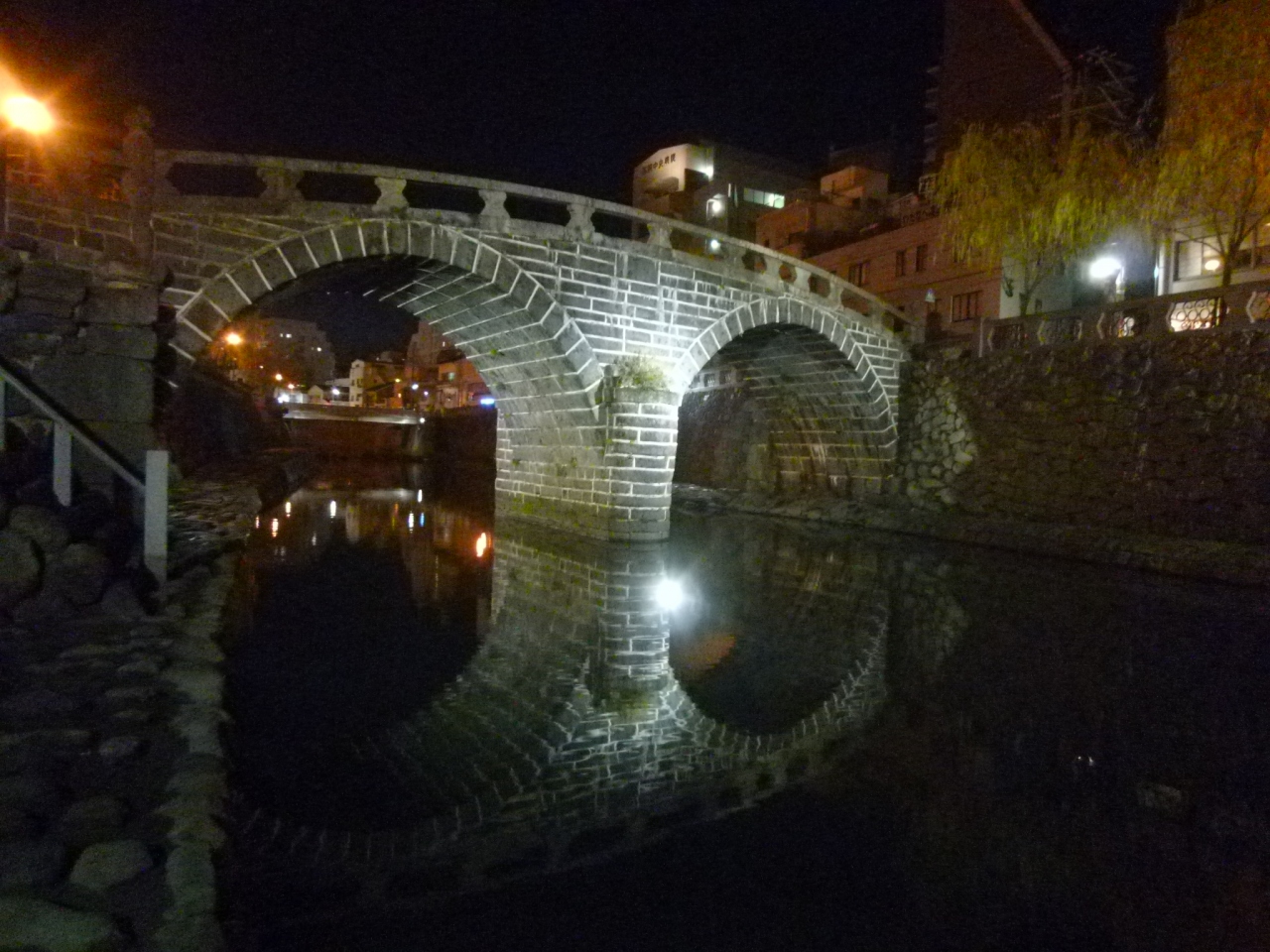 日本最古の橋で、中島川にかかる歩行者専用の橋です。夜にいったんですが、ライトアップされた橋とレトロな雰囲気の周囲はフォトスポットになります。橋の横から河原に降りられ、いろんなアングルで写真が撮れます。周囲の飲食店はあまりなく、たまたま入った居酒屋さん、刺身も他の料理の抜群に美味しかったです。