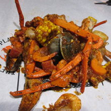 新宿駅から徒歩5分の新宿NOWAビル2階にあります。手で食べる海鮮料理をテレビで見たことがあり家族に連れて行ってもらいました。薄暗く大きな音の音楽が流れる店内の中央に手を洗うコーナーがあります。カニのカチューシャが配られ記念につけて写真を撮りました。クラブバッグ2つをキノコのチェダーチーズソースとシグニチャーソース辛口で、ココサラダバッグ、パンや飲み物を注文しました。料理が出てくるのに時間がかかり、飲み物しかない状態で、ダンスを見たり、客の誕生祝の乾杯をしたり、まだ食べてないので盛り上がりに欠けて待ちました。やっと出てきた料理はテレビで見た通りの迫力でした。チェダーチーズソースはマイルドで、柔らかいトウモロコシと食べるとコーンスープを食べているような感じでした。カニにはシグニチャーソースが合い、美味しかったです。このソースをつけて食べるガーリックトーストはカニと同じくらい美味しかったです。若者の熱気と音量に疲れましたが、面白くて楽しめました。若者が一緒でないと自分は来ないなと思いました。