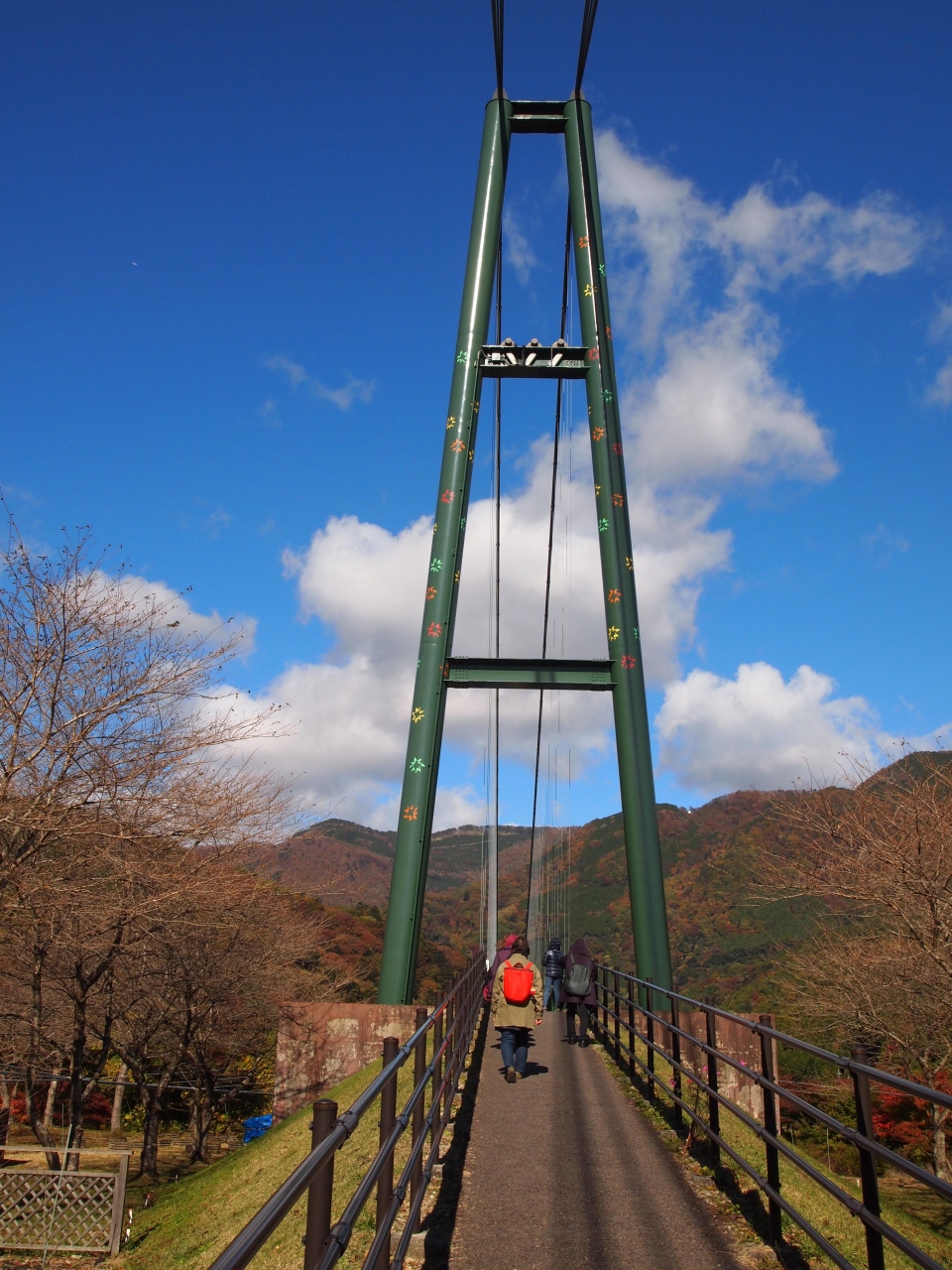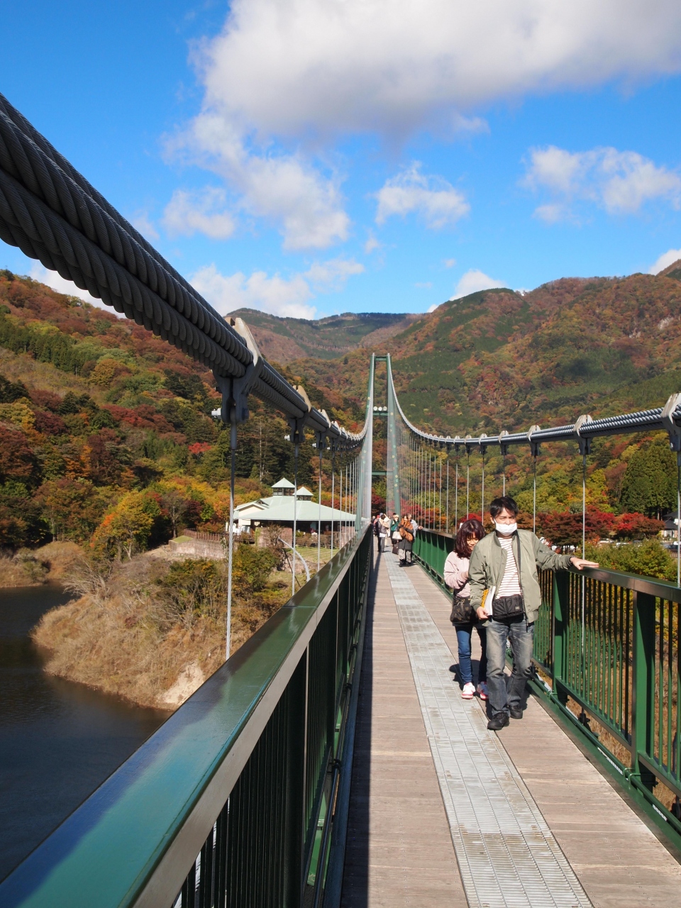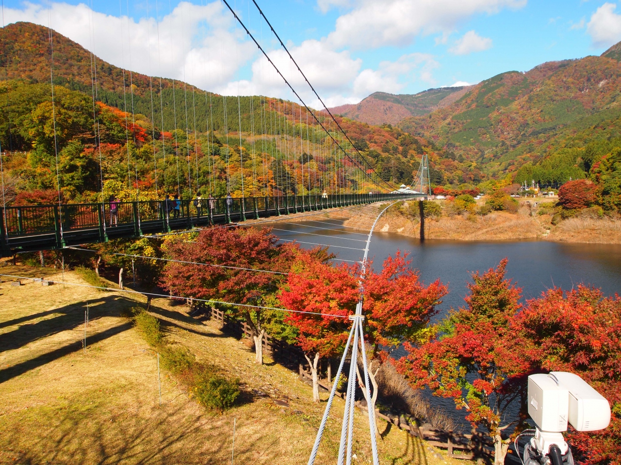 もみじ谷大吊橋は、「無補剛桁歩道吊橋」と言い、ワイヤーロープで橋自体を支える工法で出来てる歩行者専用の吊橋です。