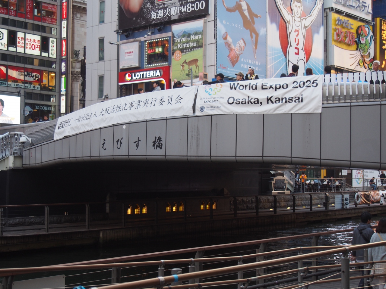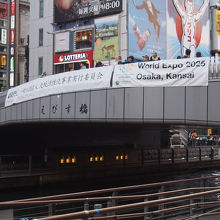 大阪みなみを代表する観光スポットで、道頓堀にかかる橋です。道頓堀にかかる橋でもっと通行人の多い通りです。日曜日の午後に歩きましたが、橋を渡っている人もいますが、多くは橋の上で立ち止まり、橋の上から道頓堀の写真を撮ったり、近くにあるグリコのネオンサインを撮ったりしています。日本人も多いですが、外国人観光客も写真を撮ったりして観光を楽しんでいます。