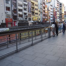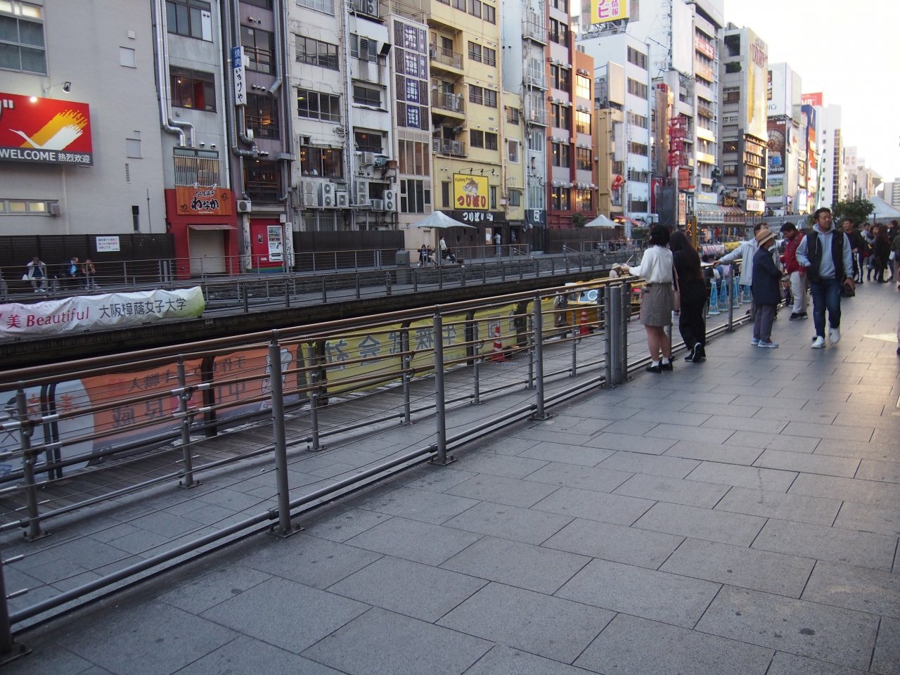 道頓堀の川沿いにある遊歩道です。戎橋から日本橋までの600mほどで遊歩道があります。地面より少し低い場所に遊歩道があるので、川の感じが寄り感じられます。川沿いにもカフェやレストラン、テイクアウトの店などがならび、遊歩道沿いの場所、ベンチなどで道頓堀を見ながら食べている人もいます。みなみに来たならば立ち寄る場所です。